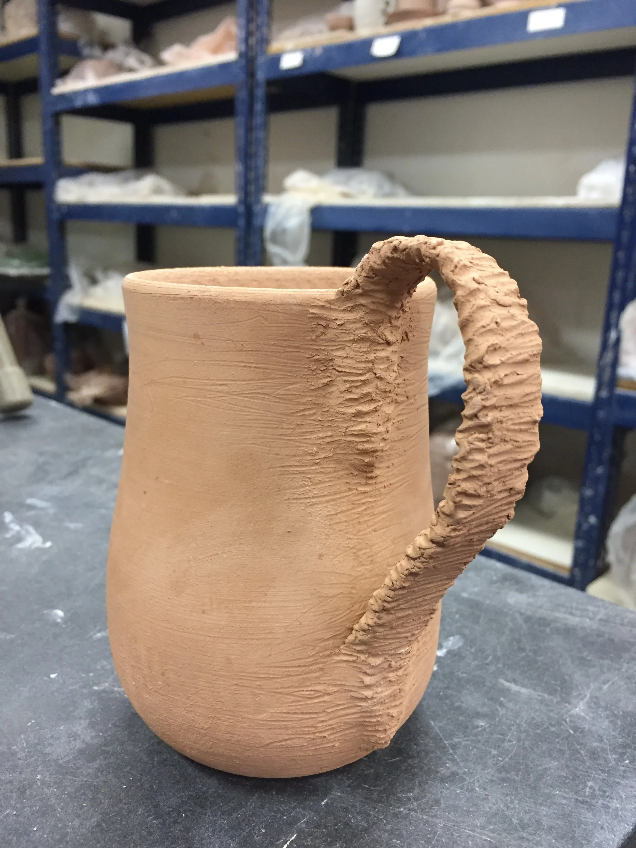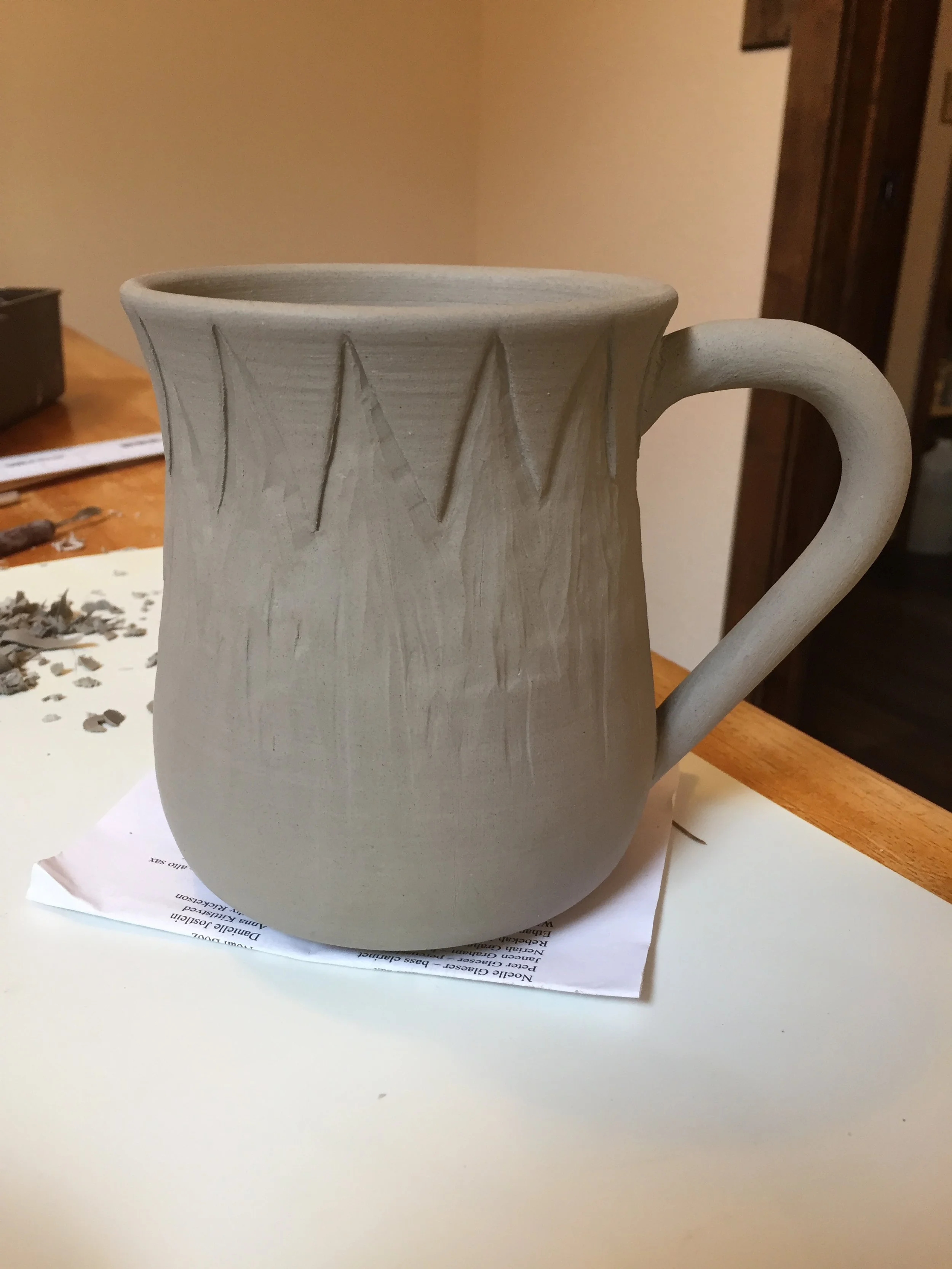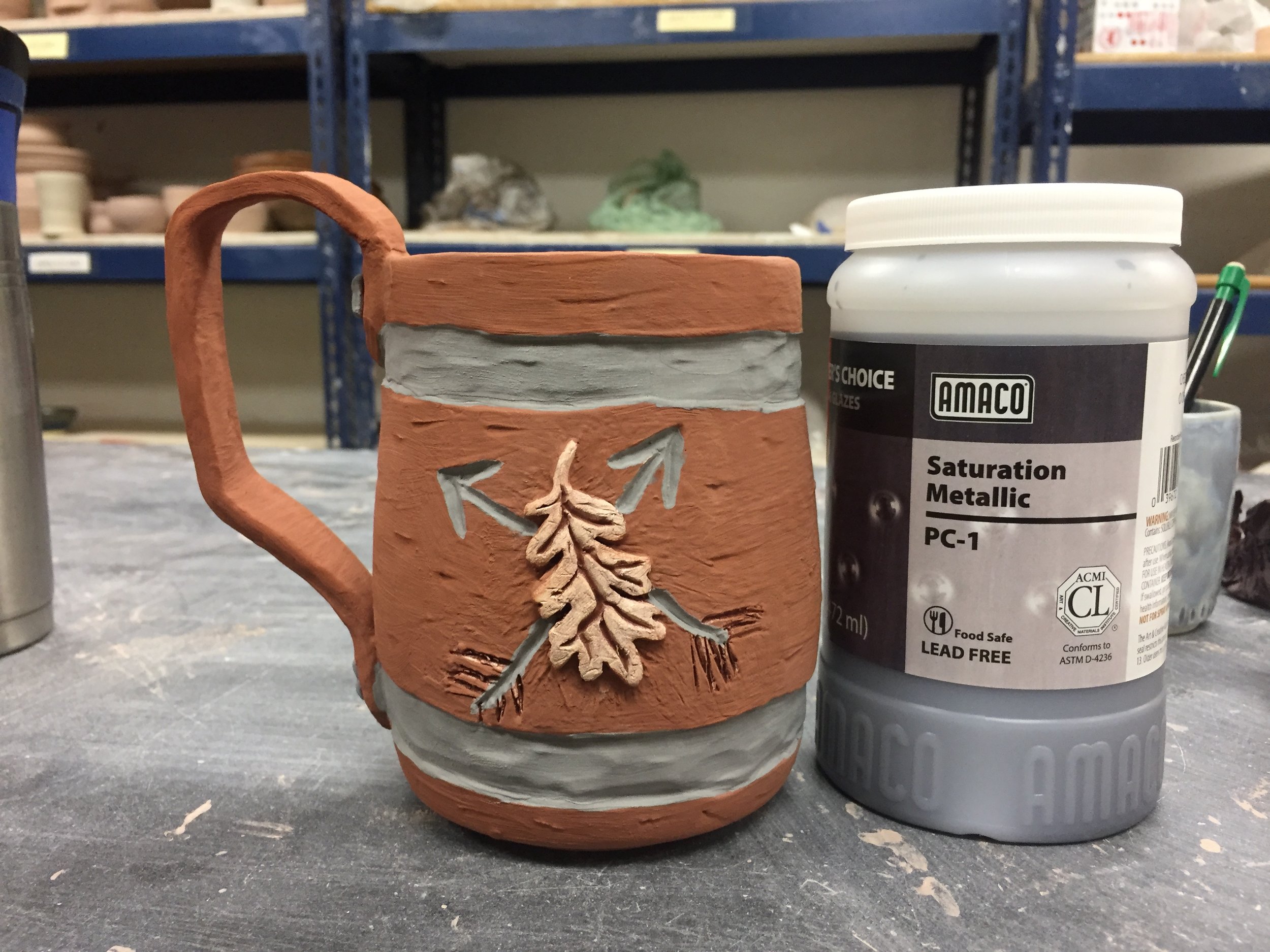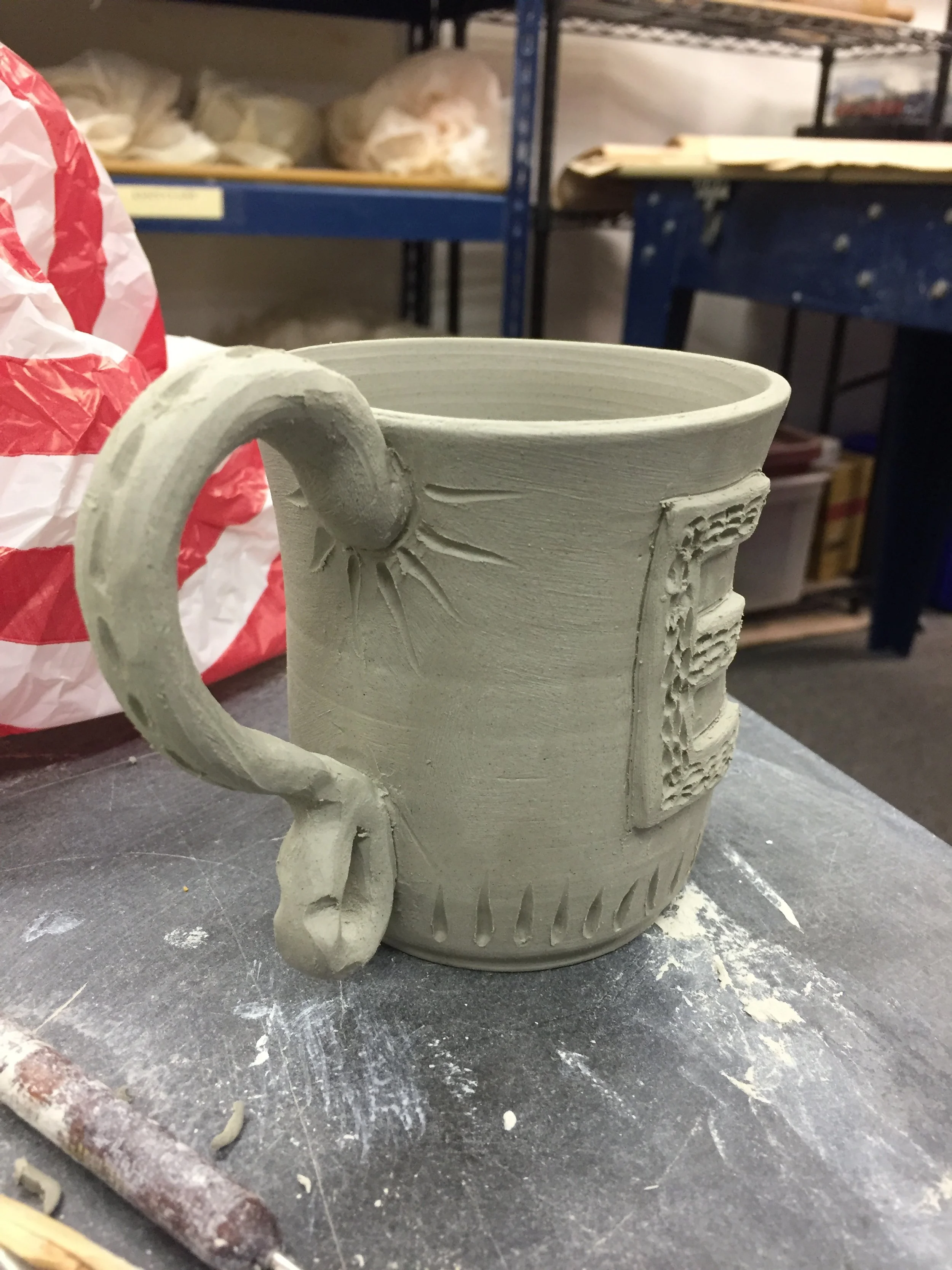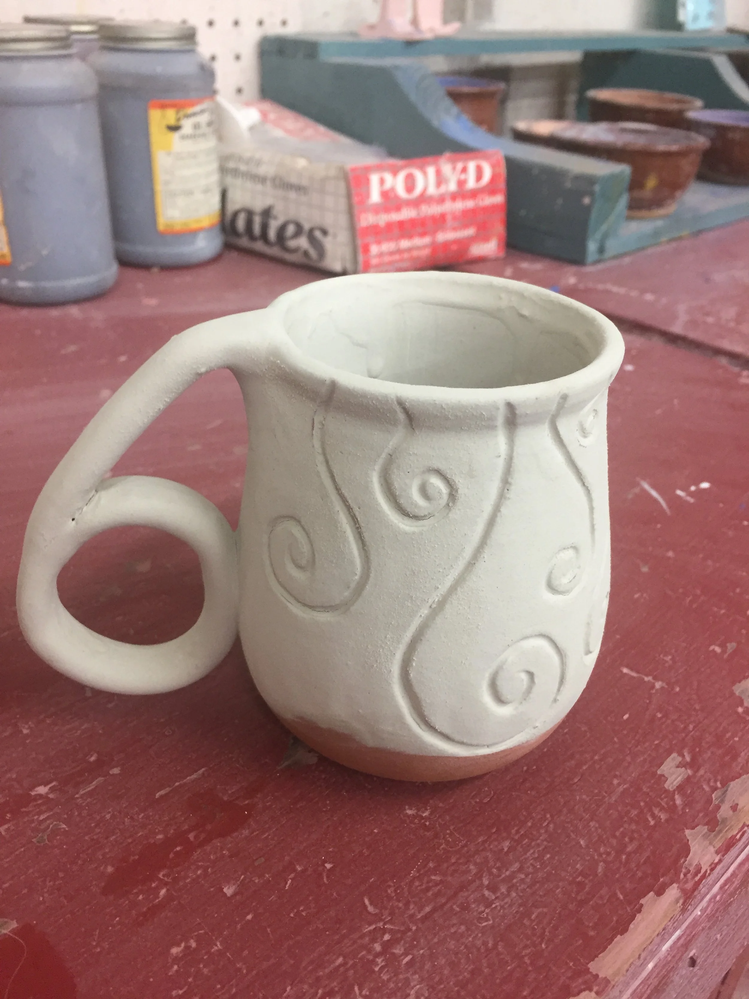 This mug took two tries. The first attempt I used brown clay. Sadly that one cracked in the final glaze firing.
