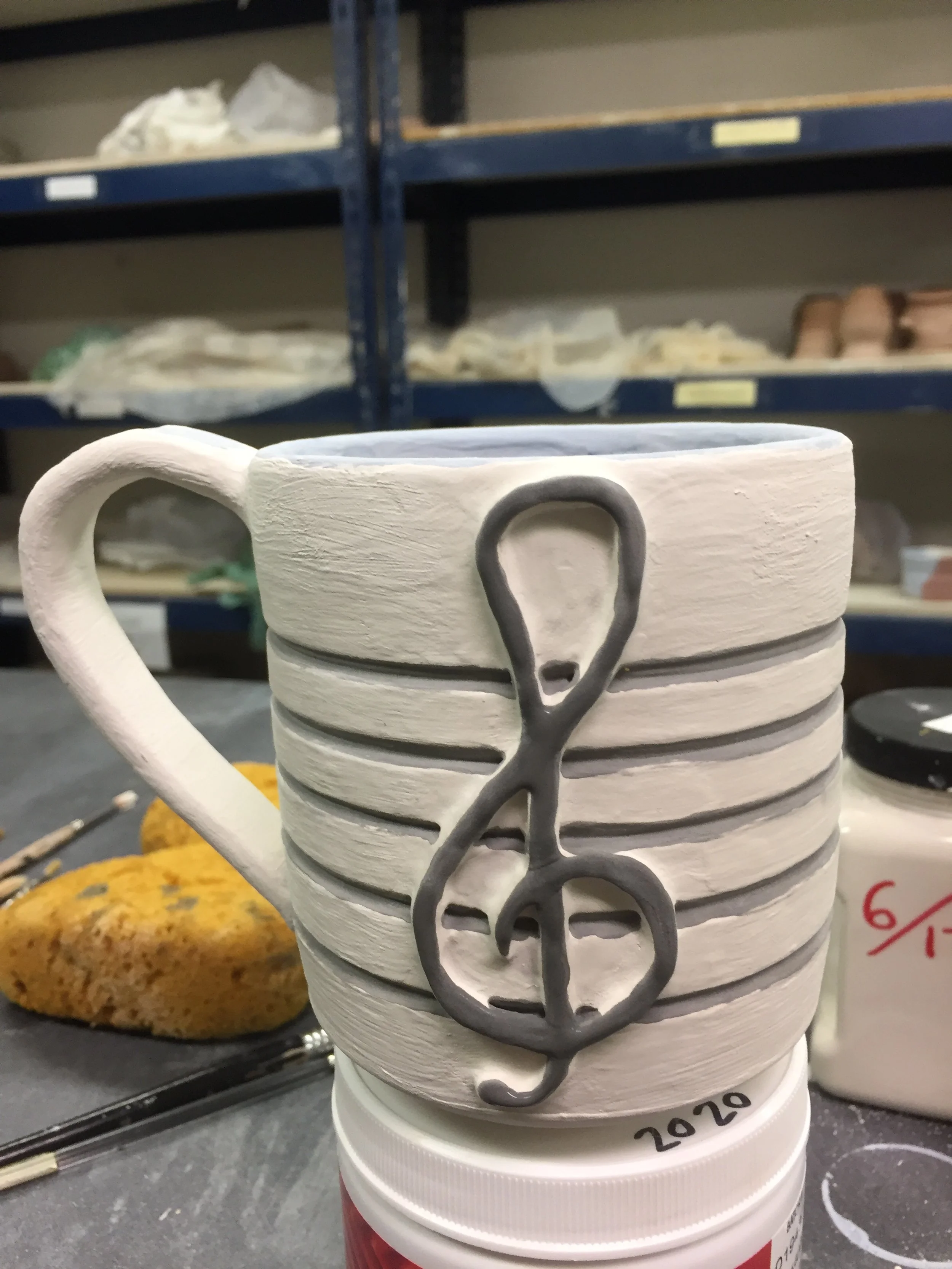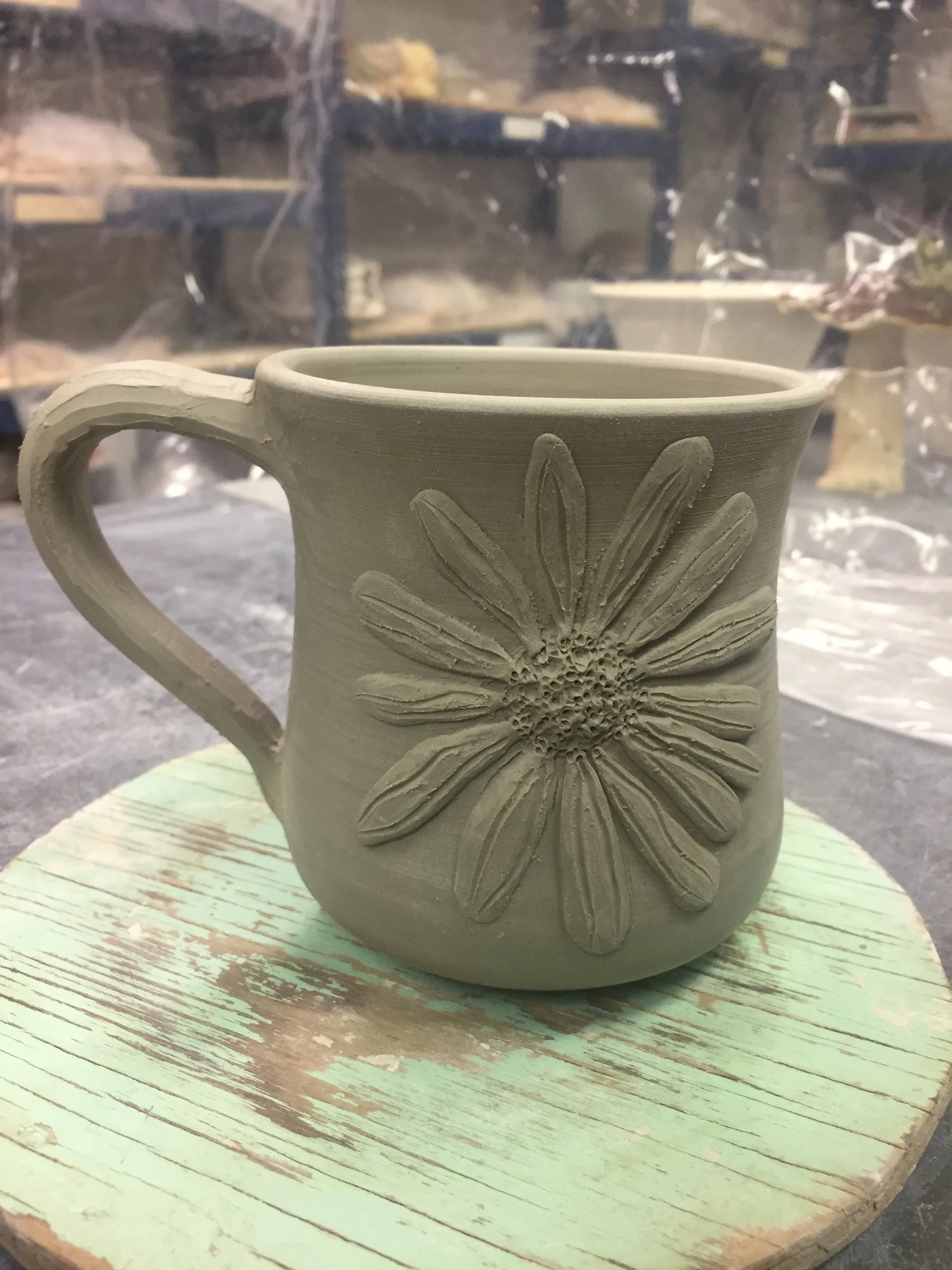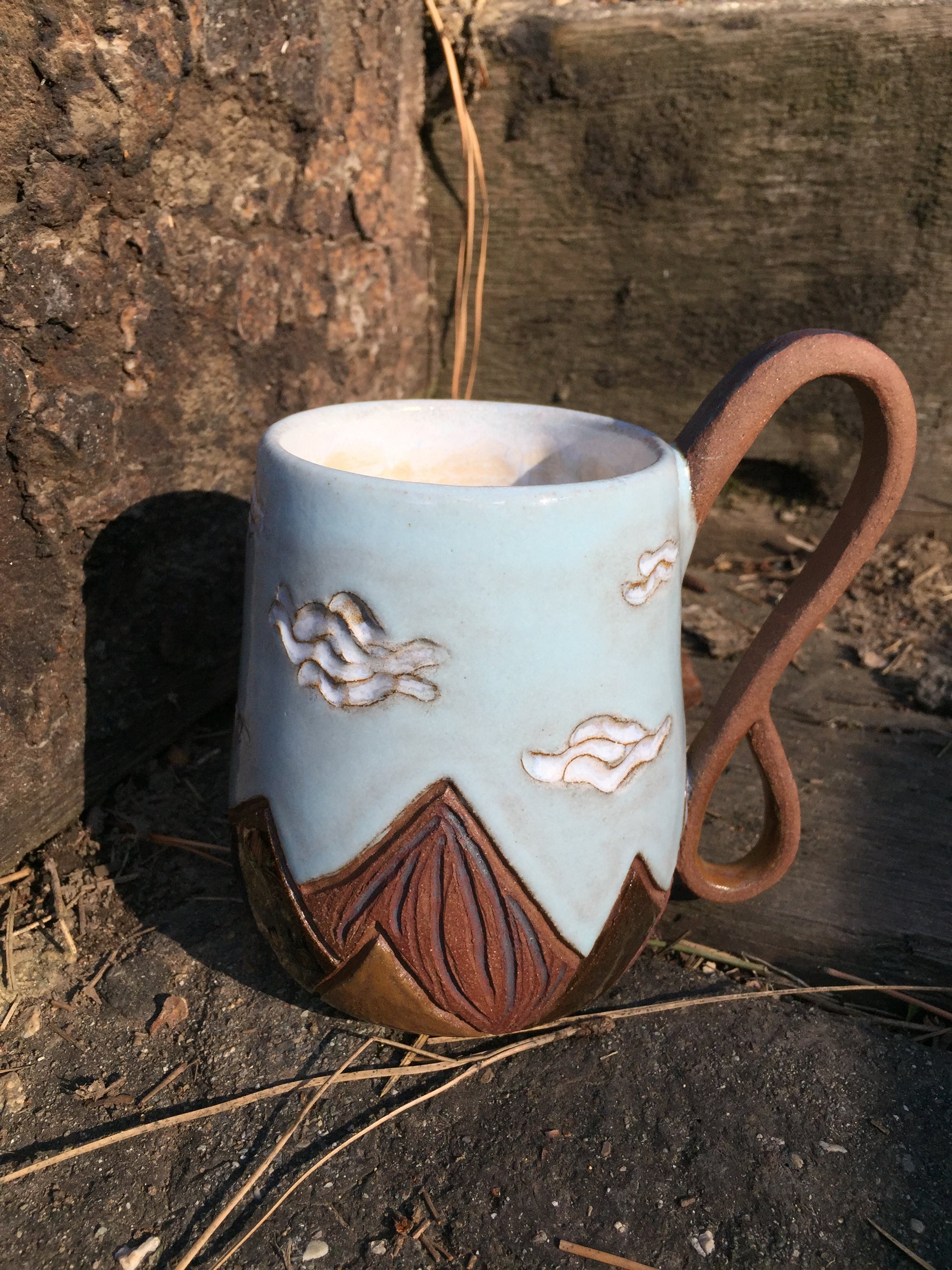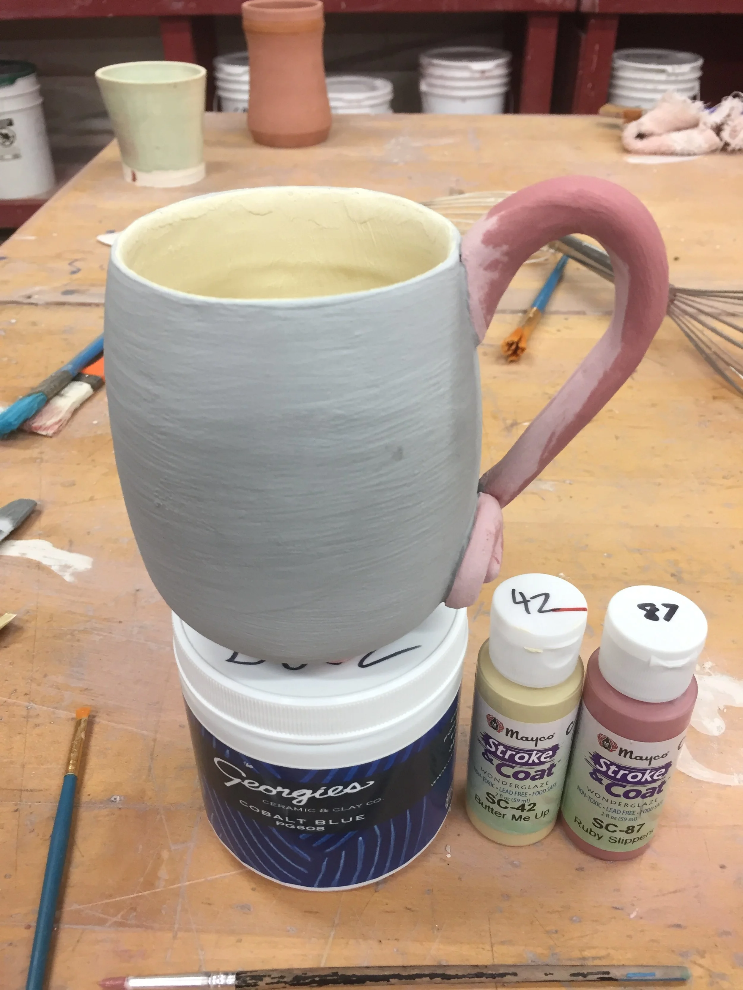 This mug took two tries. The first attempt I used brown clay. Sadly that one cracked in the final glaze firing.