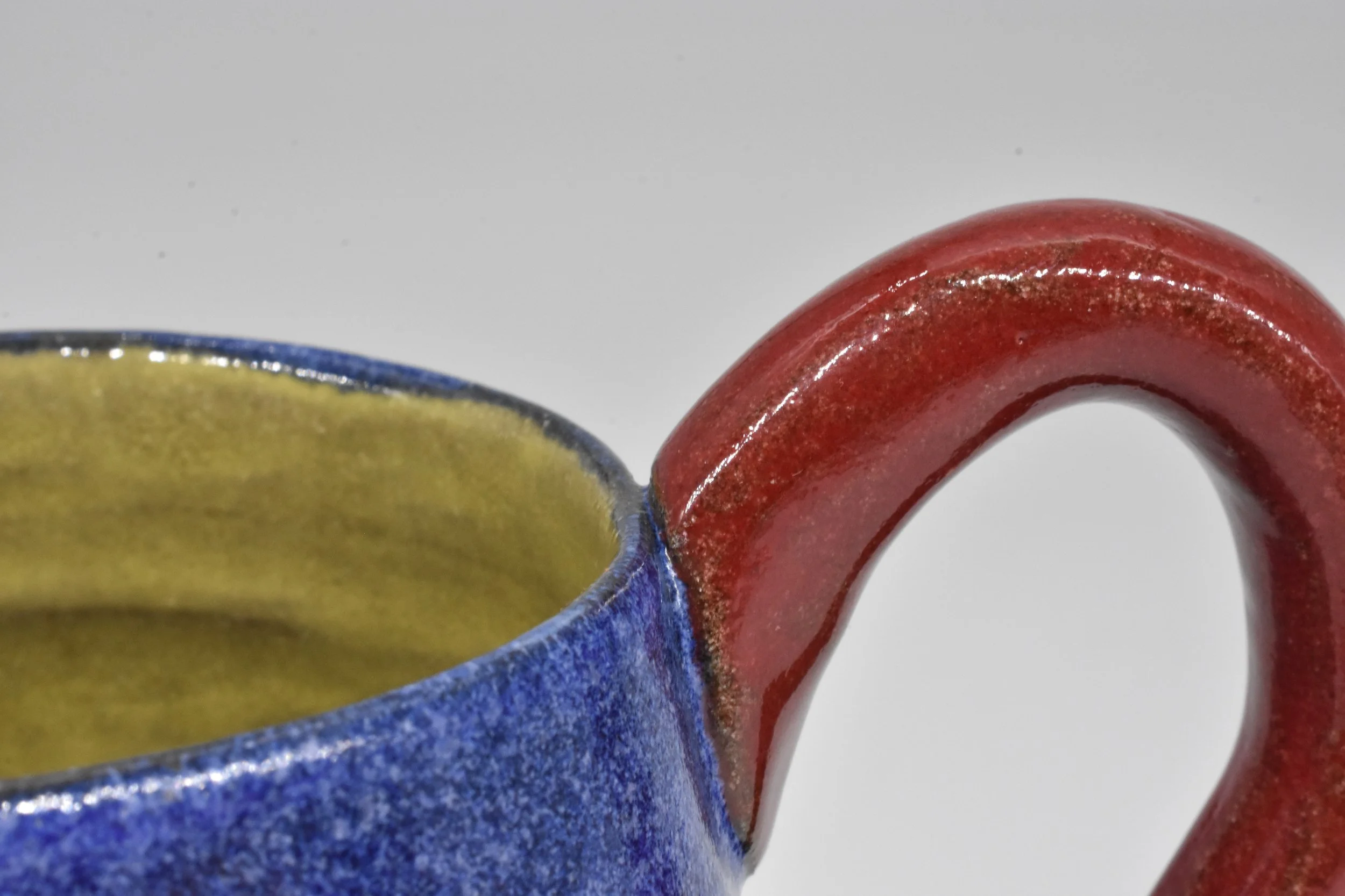 This glaze only turns blue in thicker areas. In addition I added a flowing glaze in the lines, handle, and inside rim.