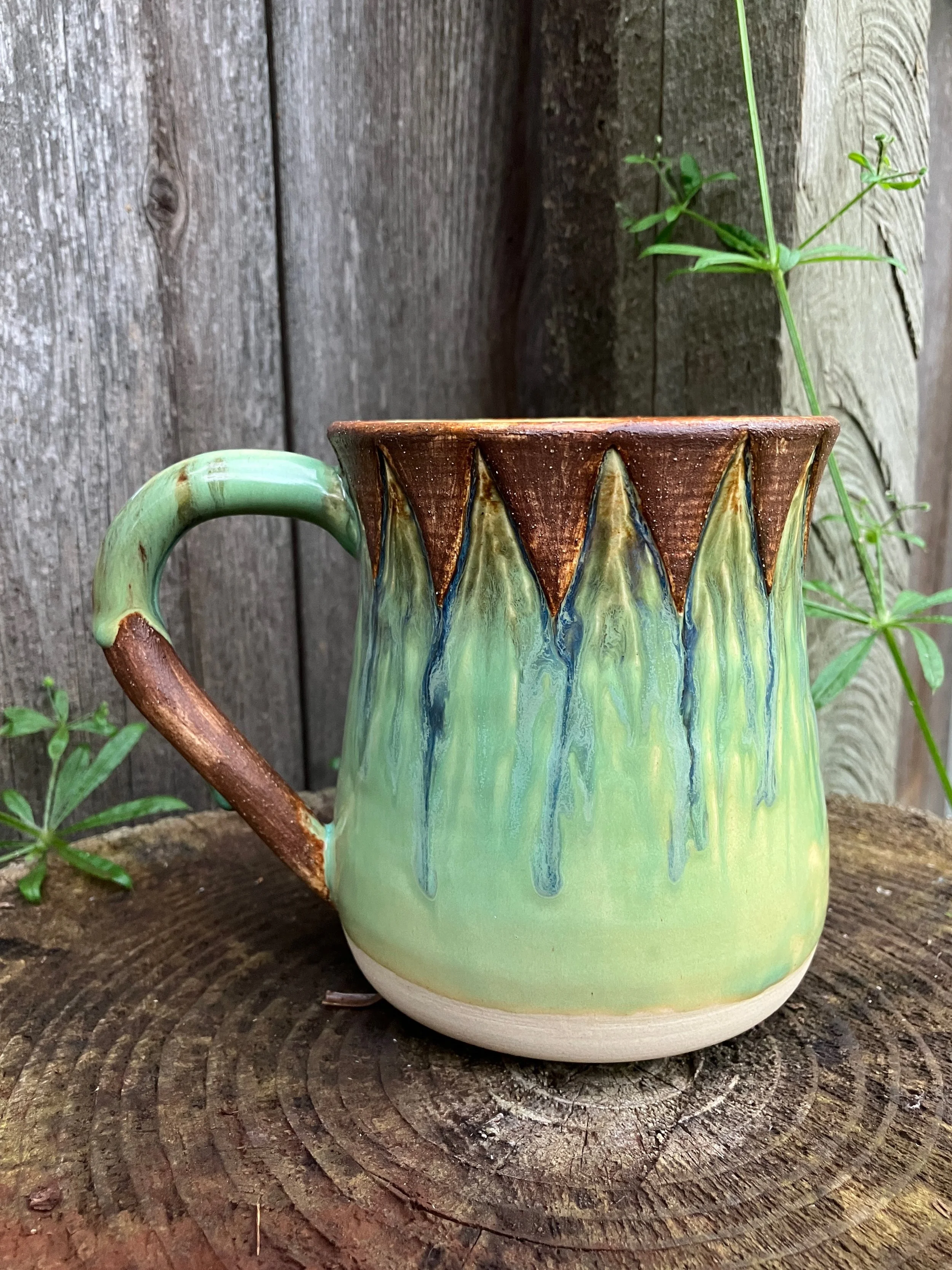 This mug dates to when I was making Daddy’s mug and can be seen on the glaze shelf in the pictures above. The orange band on the unfired mug became the blue color dripping by the triangles.