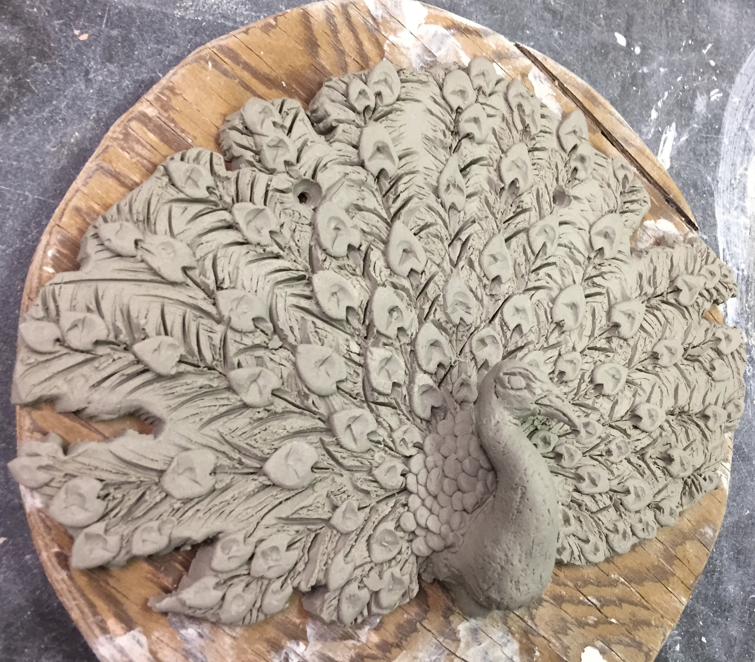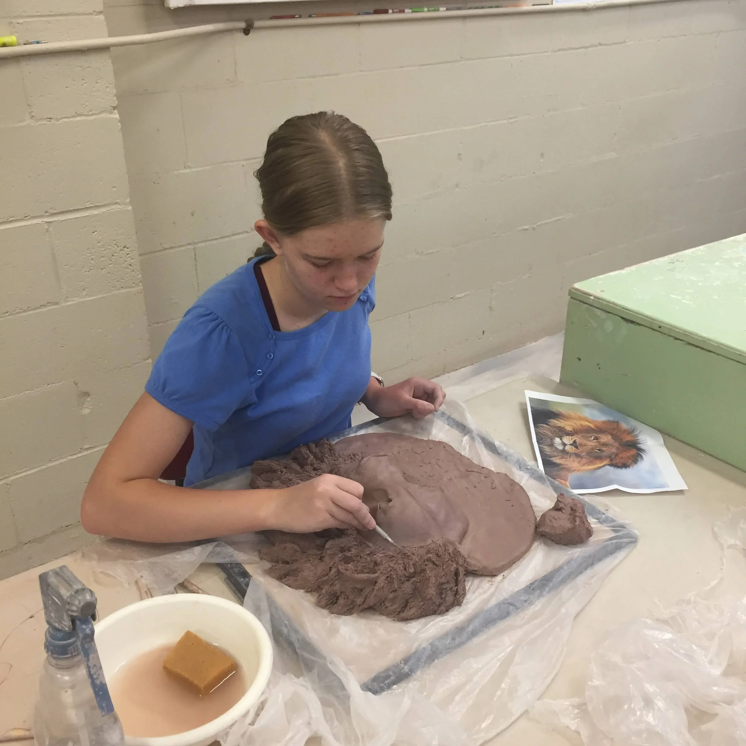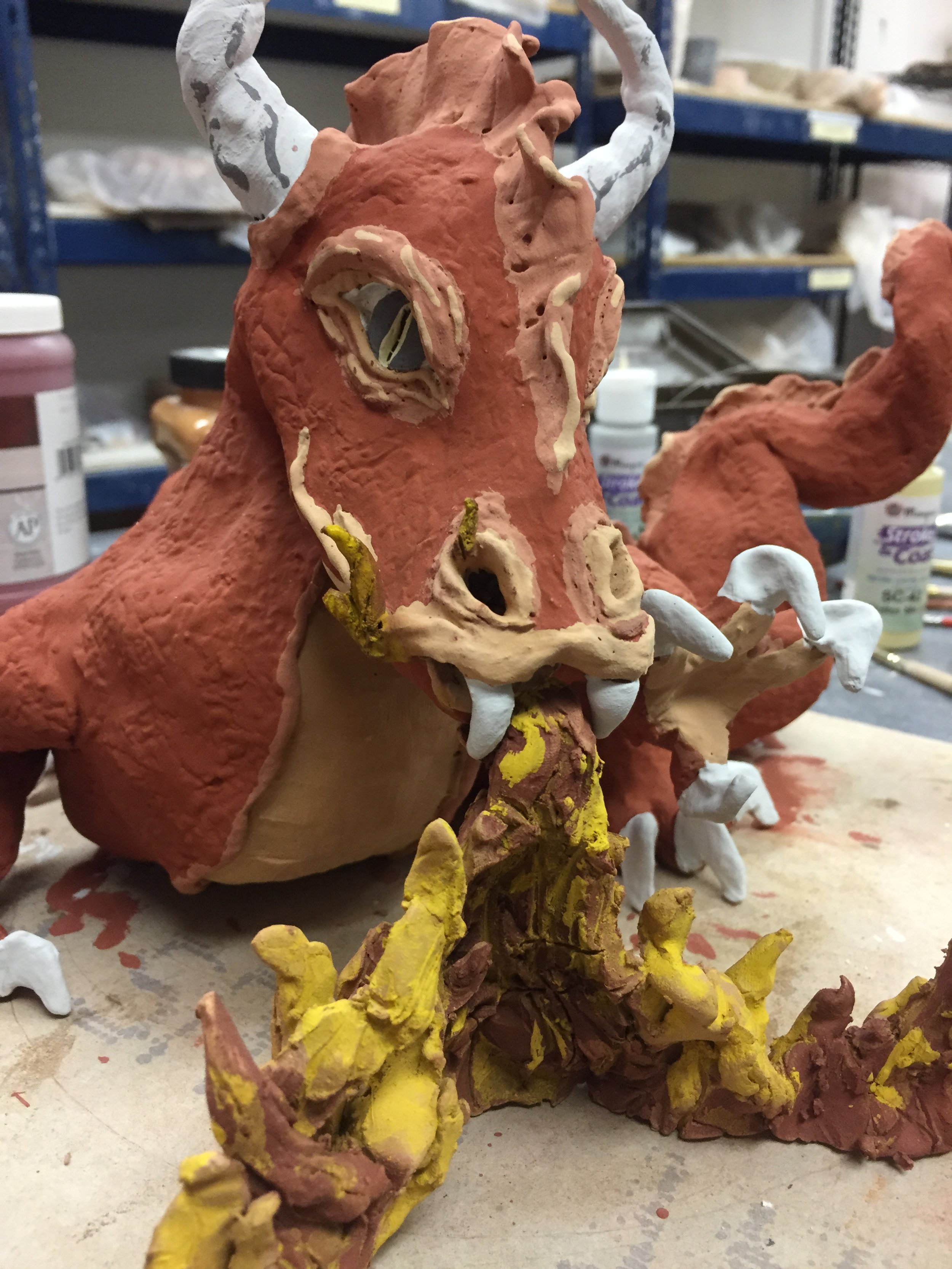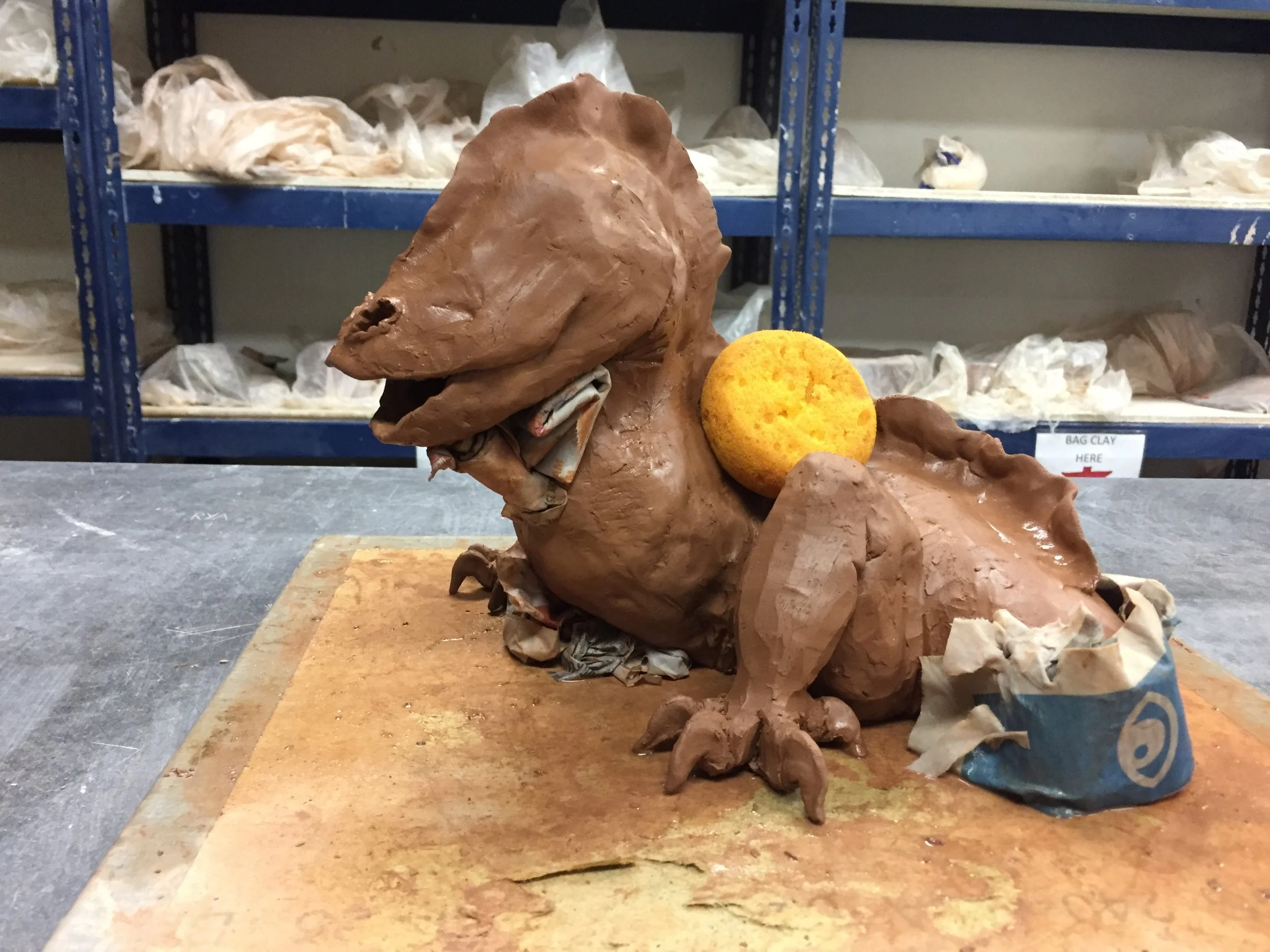 One of the mistakes that I made and learned from on this project was that I did not plan out my structure so ended up with a solid mane instead of a hollow one. To fix this I had to flip over the whole face and scrape out the excess clay without cutting through to the front!