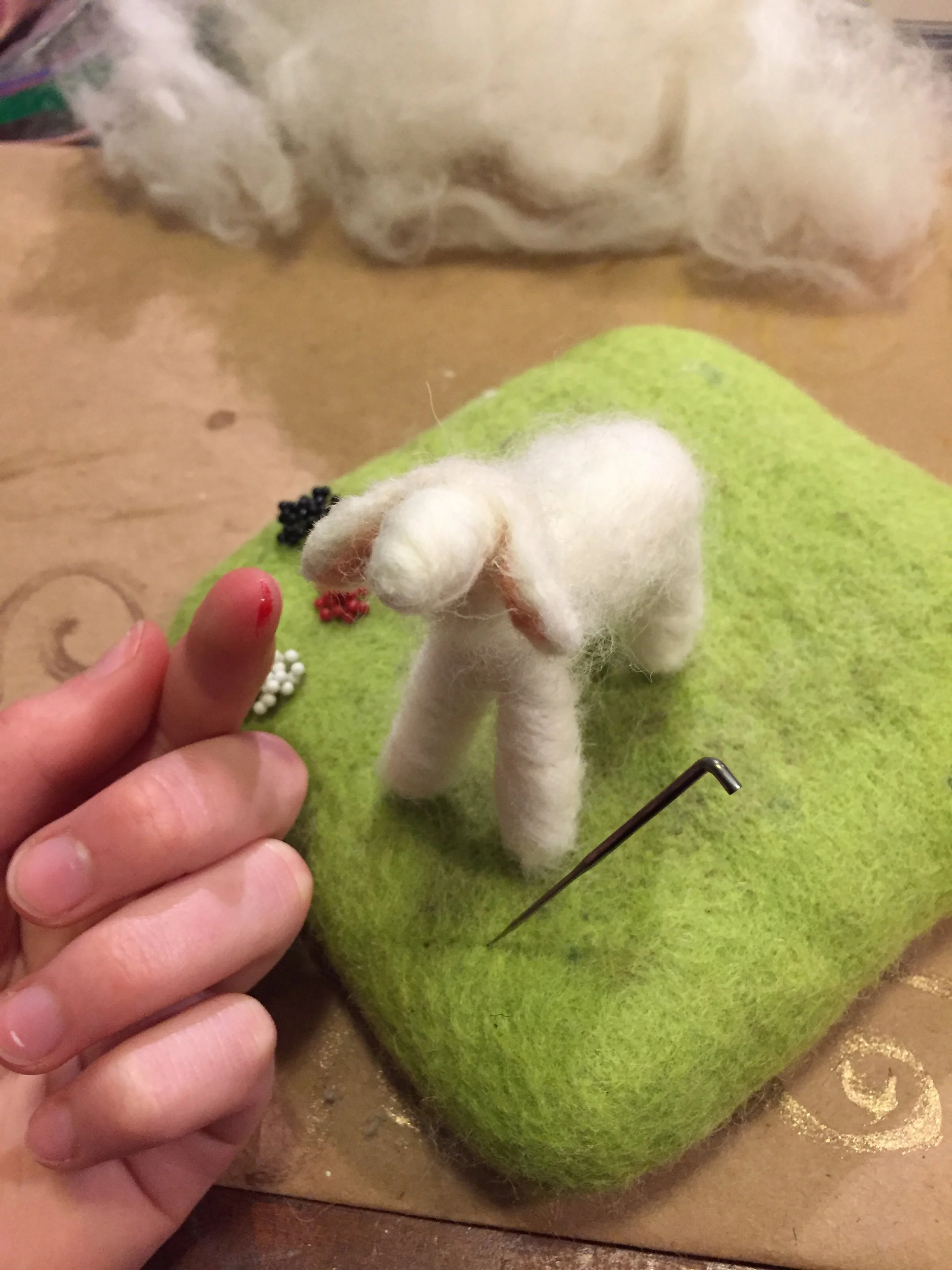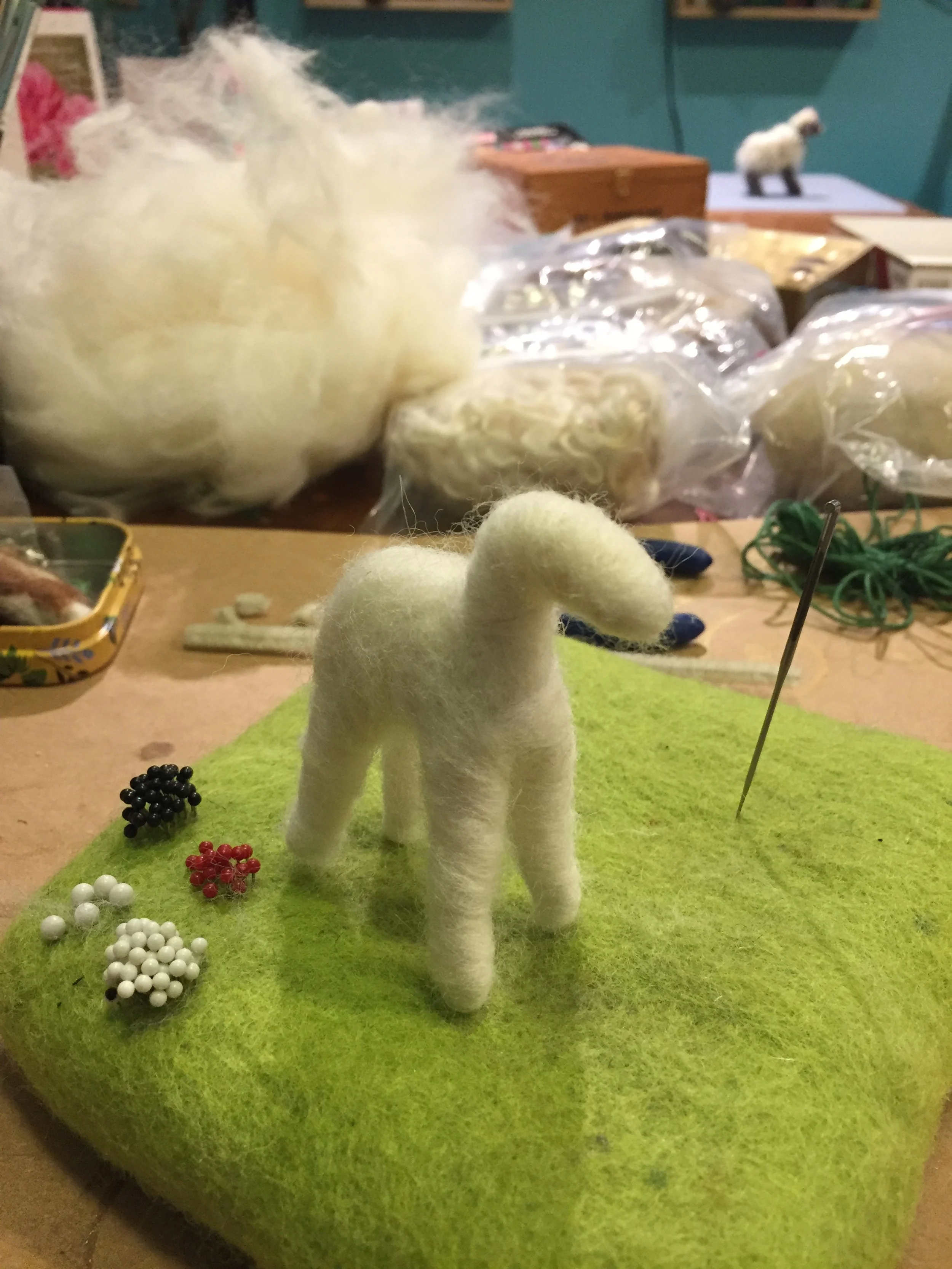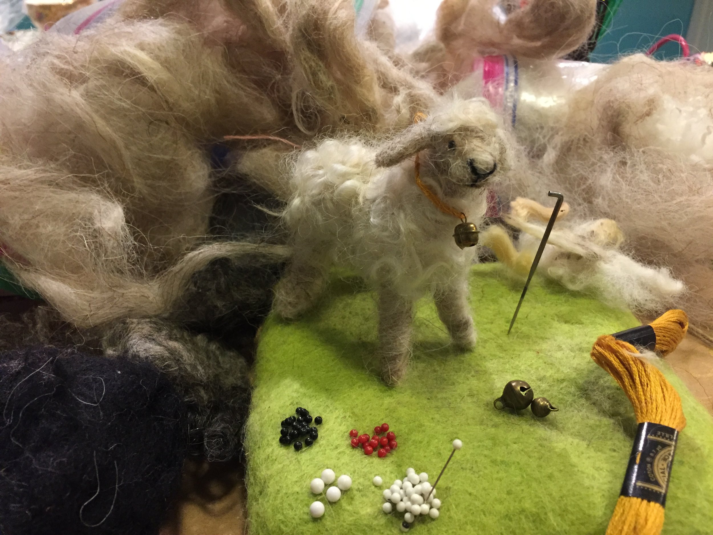 Finally I add pins for eyes, an embroidery floss collar, a mini bell, a thread nose/mouth, and most importantly a lot of raw real sheep curls.